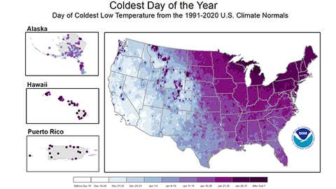 NOAA's National Centers for Environmental Information (NCEI) produced updated maps illustrating when the coldest day of the year, on average, occurs across the United States, based on the latest version of 30-year climate normals ending in 2020.